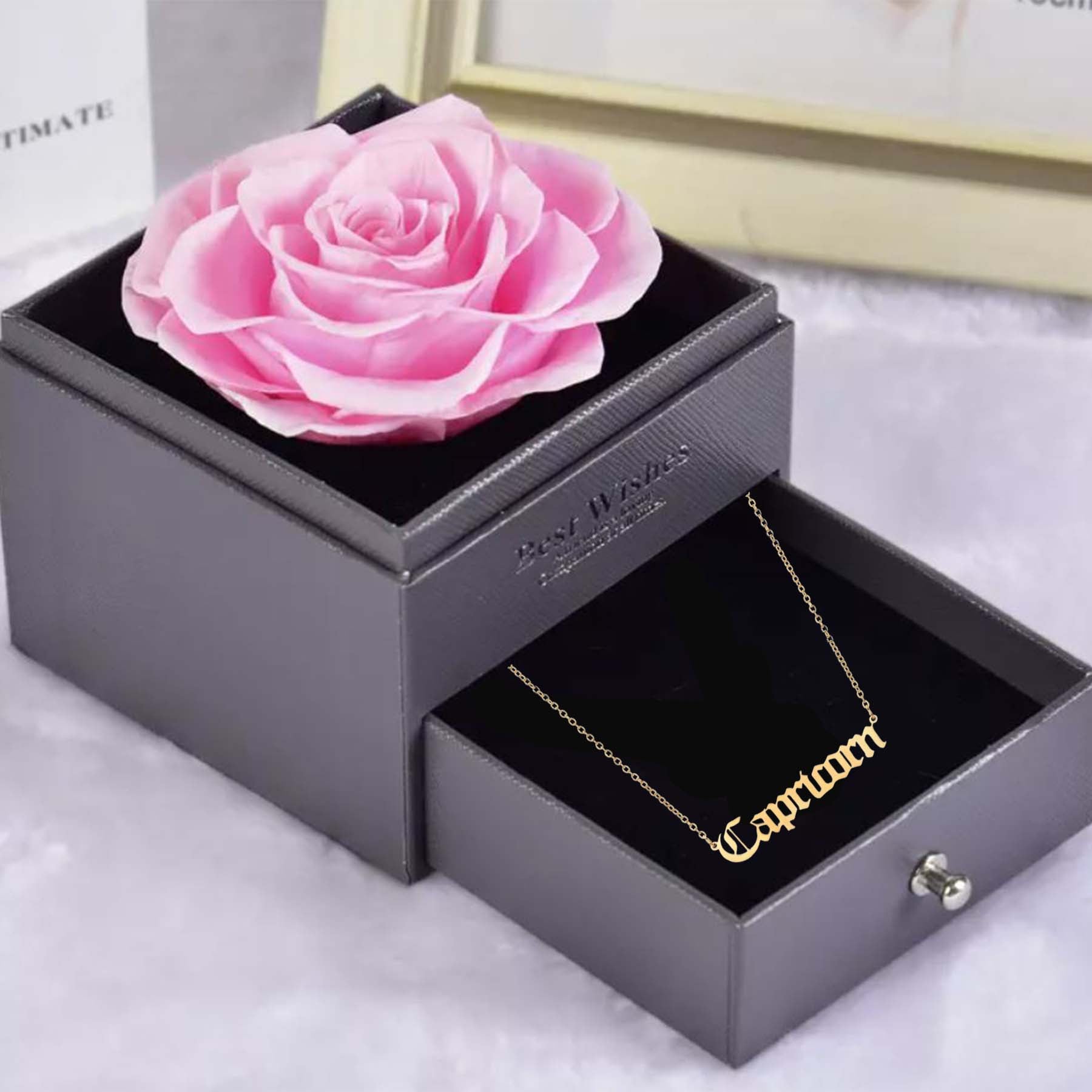 Preserved rose is displayed in an elegant jewelry box which has a small drawer itself. There is a real gold plated necklace inside the Drawer. The rose jewelry box is a best gift for your beloved one.