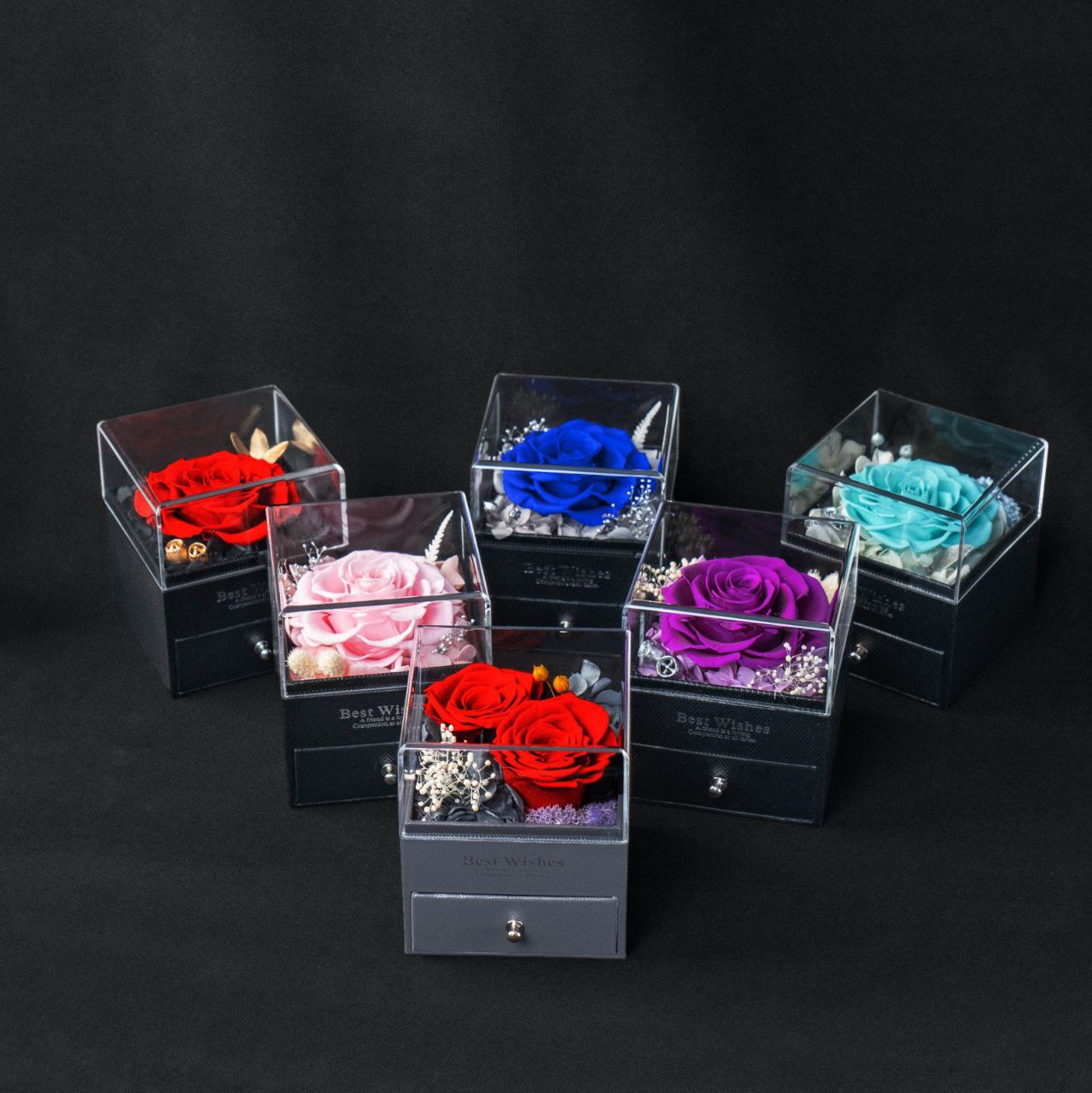 Preserved rose is displayed in an elegant jewelry box which has a small drawer itself. There is a real silver plated necklace inside the Drawer. The rose jewelry box is a best gift for your beloved one.