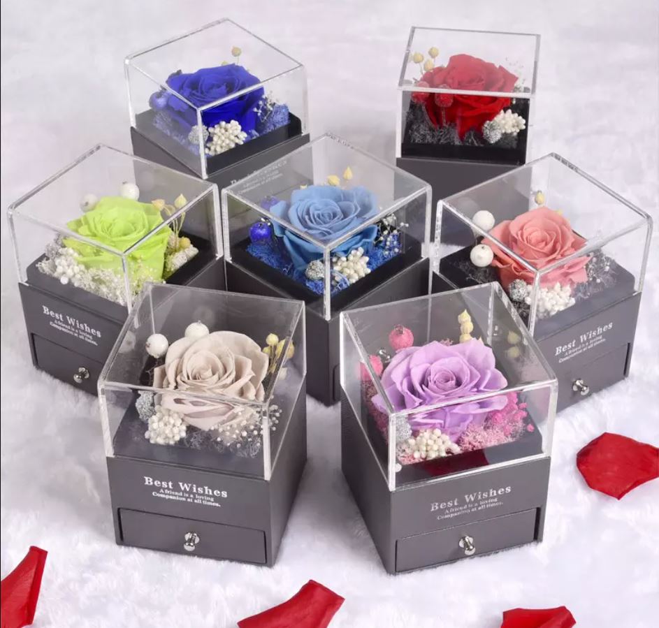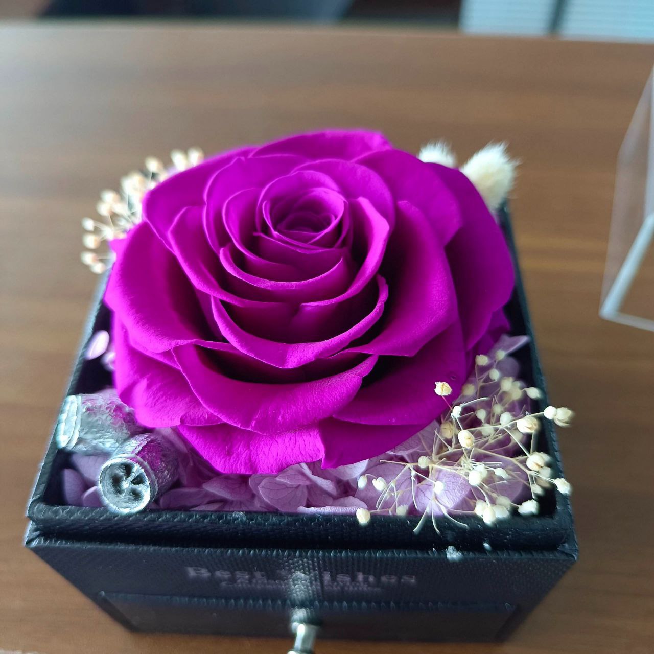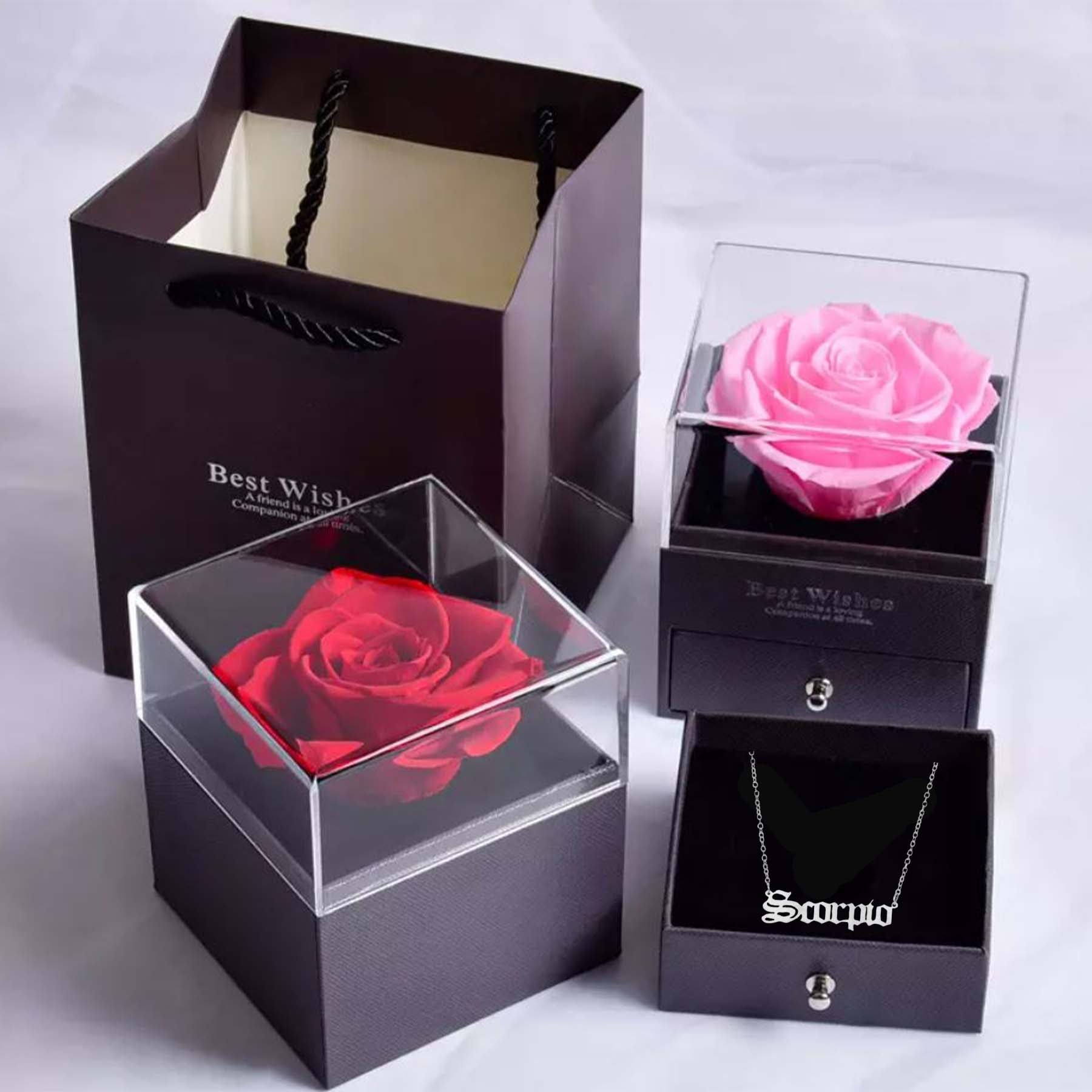 Preserved rose is displayed in an elegant jewelry box which has a small drawer itself. There is a real silver plated necklace inside the Drawer. The rose jewelry box is a best gift for your beloved one.