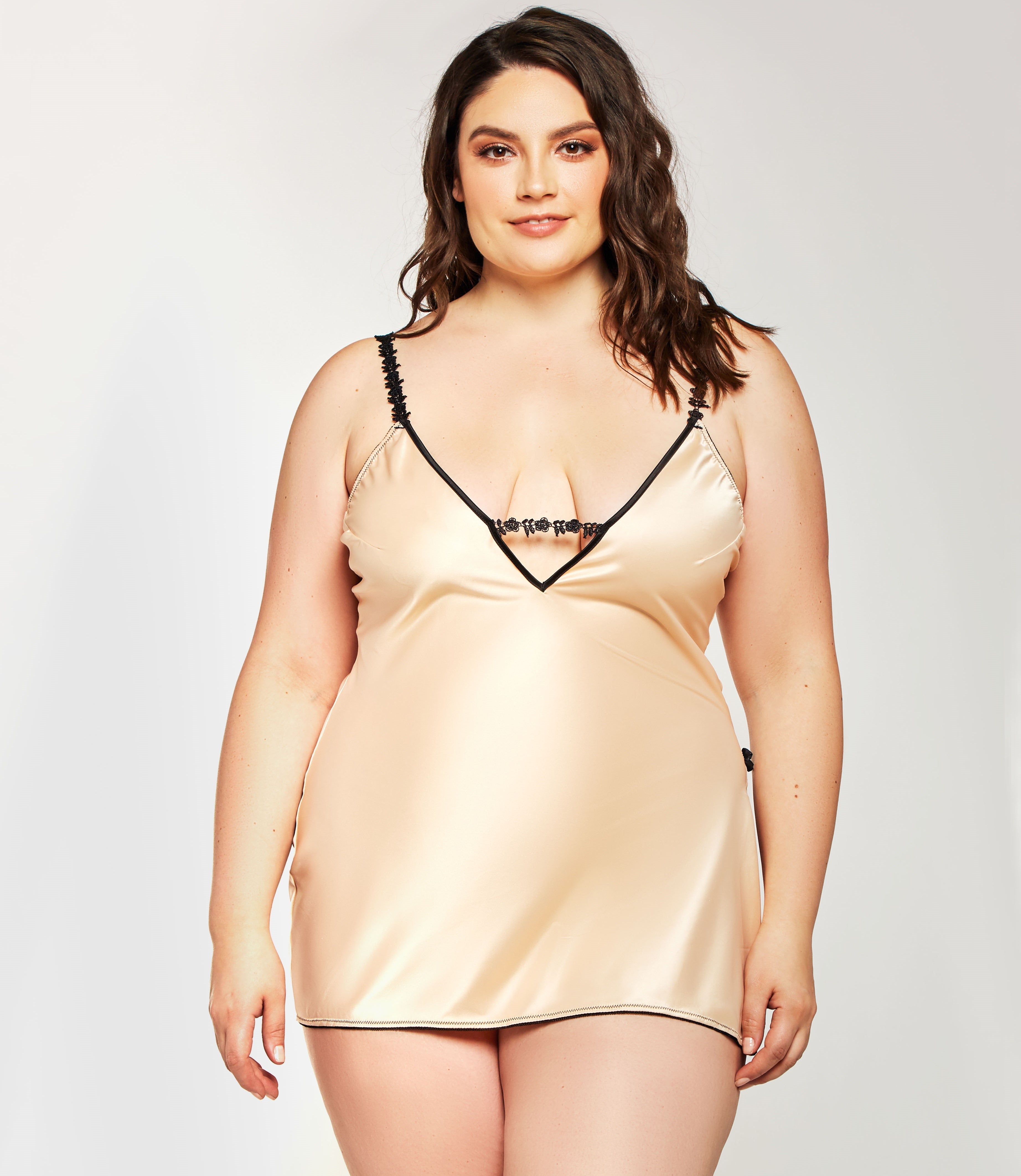 Stretch satin chemise with black venetian lace trim, side slit and lace up back with matching g-string.