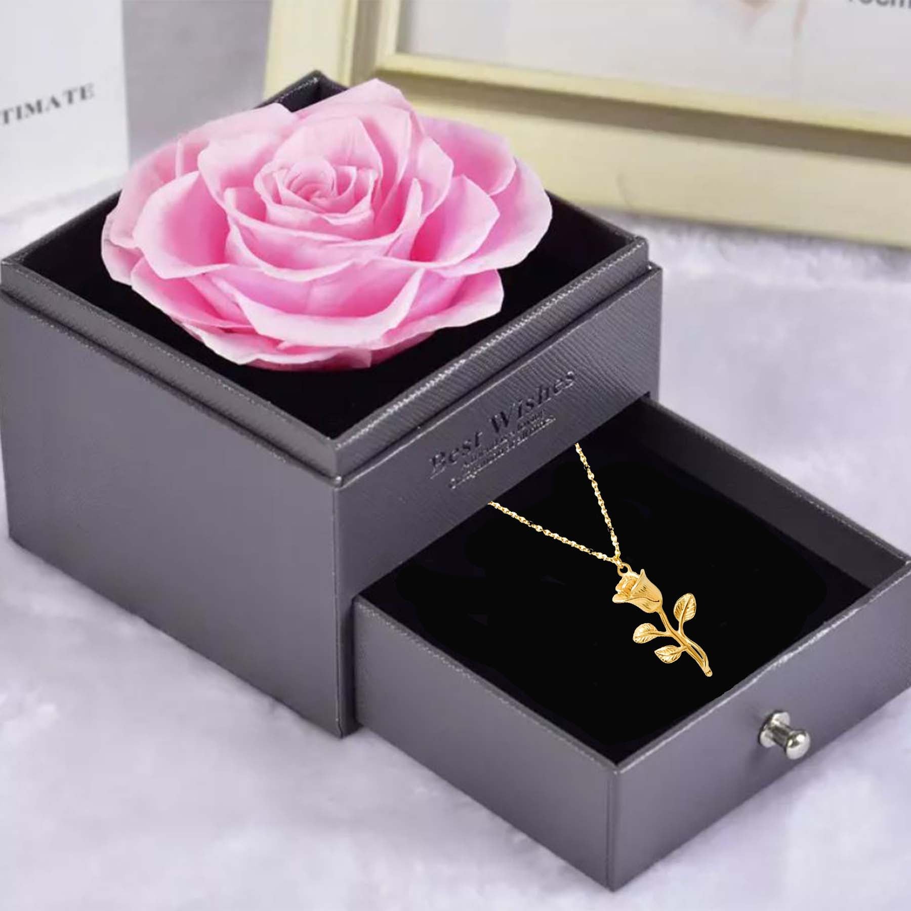 Preserved rose is displayed in an elegant jewelry box which has a small drawer itself. There is a real gold plated necklace inside the Drawer. The rose jewelry box is a best gift for your beloved one.