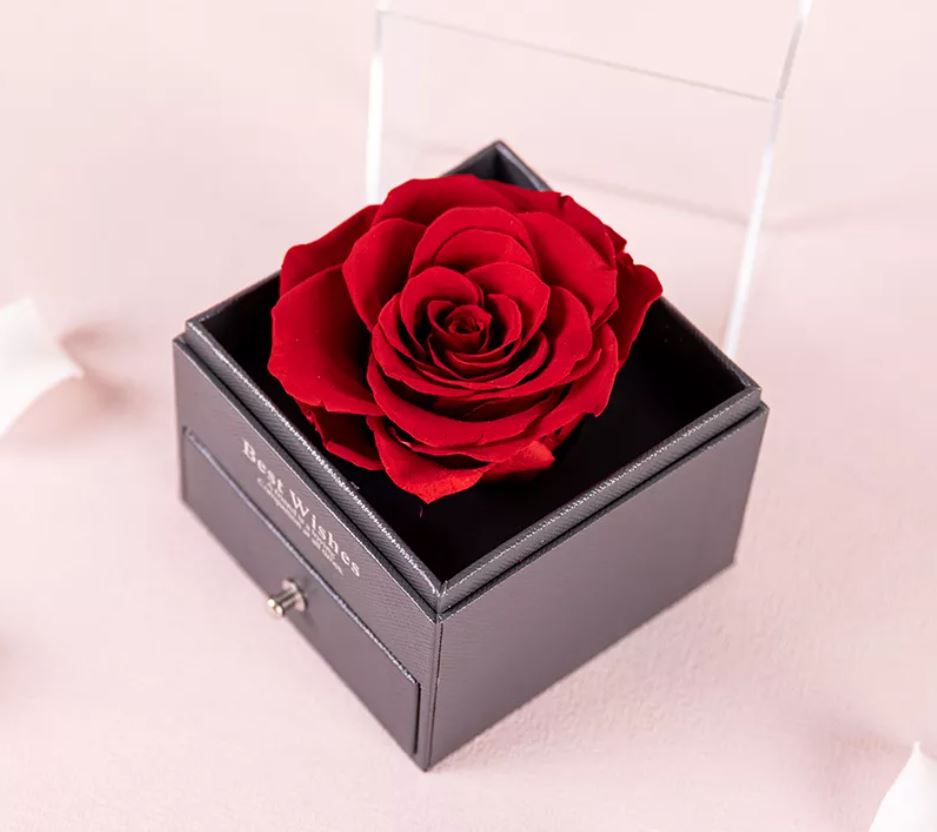 Preserved rose is displayed in an elegant jewelry box which has a small drawer itself. There is a real gold plated necklace inside the Drawer. The rose jewelry box is a best gift for your beloved one.