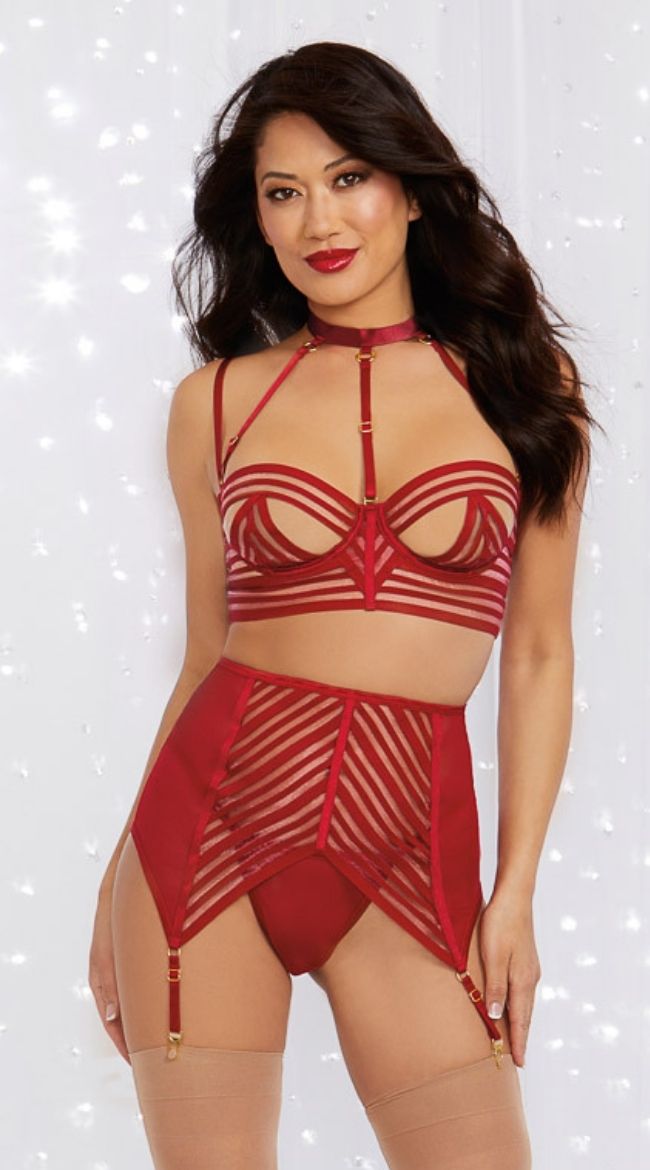 Description: Sheer striped elastic, collared, strappy underwire long-line bra, high waist garter belt and G-string 3-piece set • Removeable collar and neck straps • Shiny gold decorative rings and hardware • Hook and eye back closures • Adjustable straps • Mitre’d sheer stripe details on garter belt