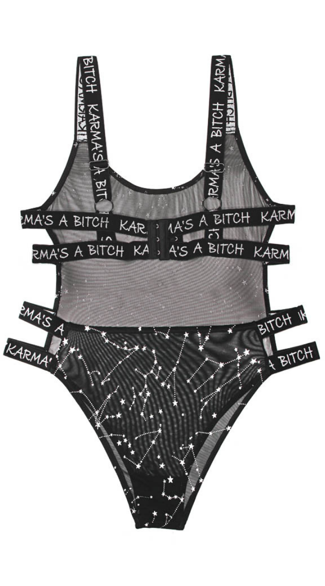 • Open sides with thick elastic straps featuring a "KARMA'S A BITCH" print