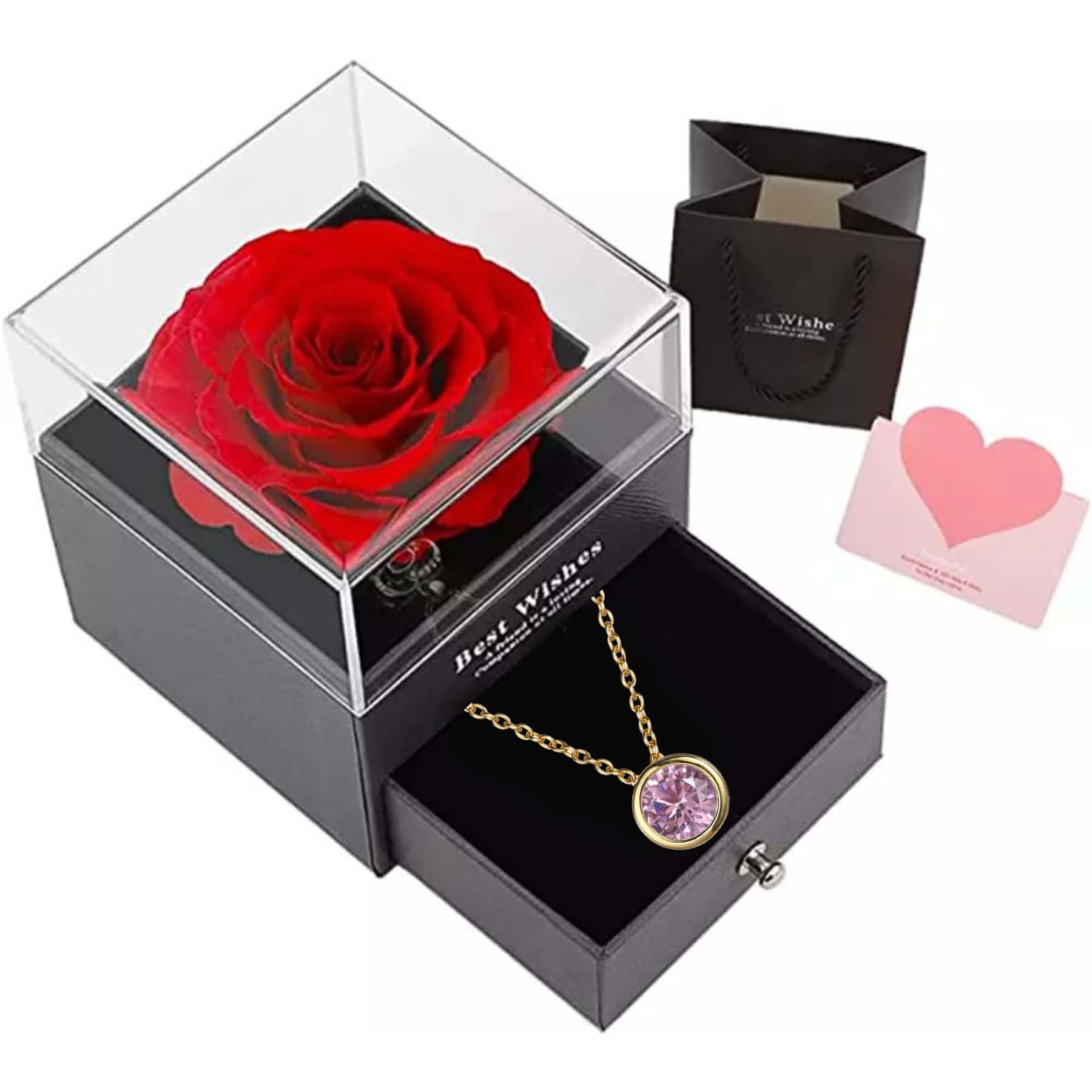 Preserved rose is displayed in an elegant jewelry box which has a small drawer itself. There is a real gold plated necklace inside the Drawer. The rose jewelry box is a best gift for your beloved one.