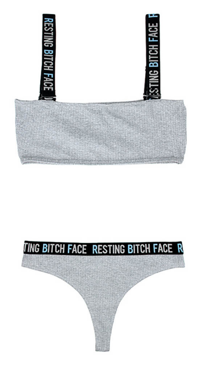 • Soft bralette with a cropped design and thick, adjustable elastic straps featuring a "RESTING BITCH FACE" print.